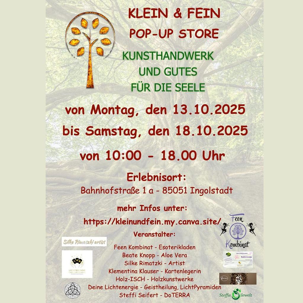 Ingolstadt – Vom 13. bis 18. Oktober 2025 öffnet in der Bahnhofstraße 1a, direkt am Hauptbahnhof, ein außergewöhnlicher Pop-up-Store seine Türen: „KLEIN & FEIN“. Sechs kreative Kleinunternehmer laden dazu ein, ihre energetischen, künstlerischen und handgefertigten Schätze zu entdecken.
