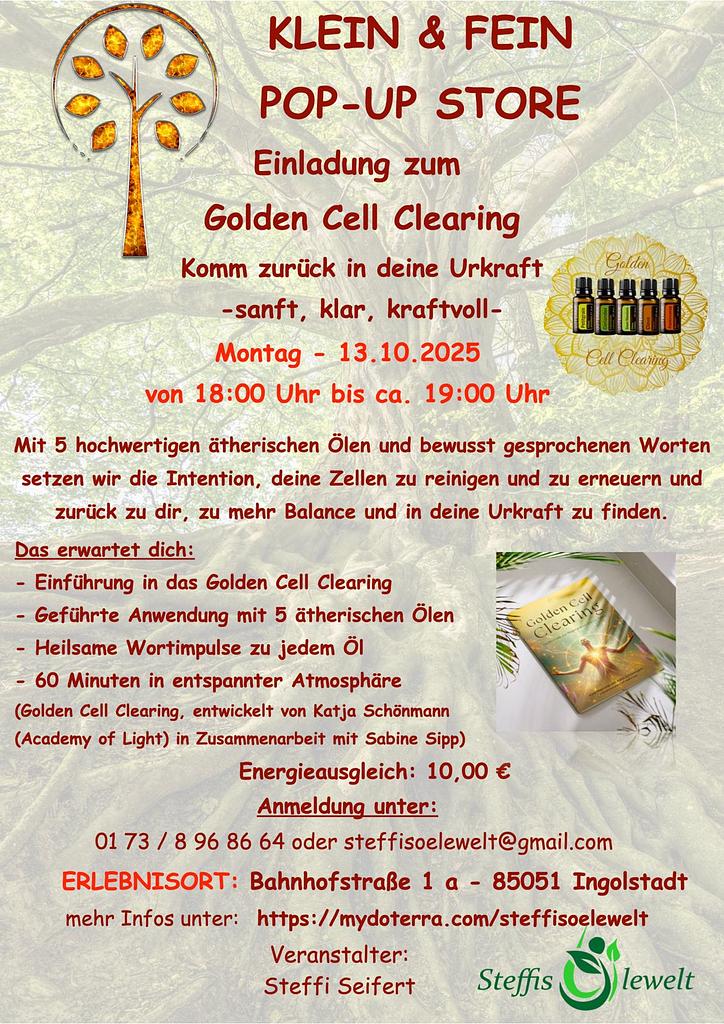 - Einführung in das Golden Cell Clearing ,- Geführte Anwendung mit 5 ätherischen Ölen, - Heilsame Wortimpulse zu jedem Öl ,- 60 Minuten in entspannter Atmosphäre
